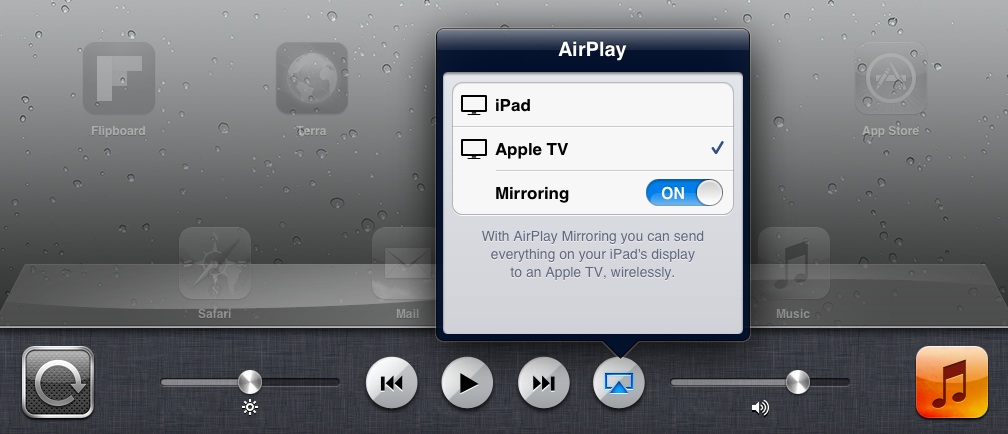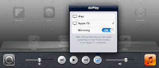 - Turn on iPad, double click circular button near where you plug in the power cord, slide toolbar to the right, click button the looks like a computer, select Apple TV, and then set to mirroring on.